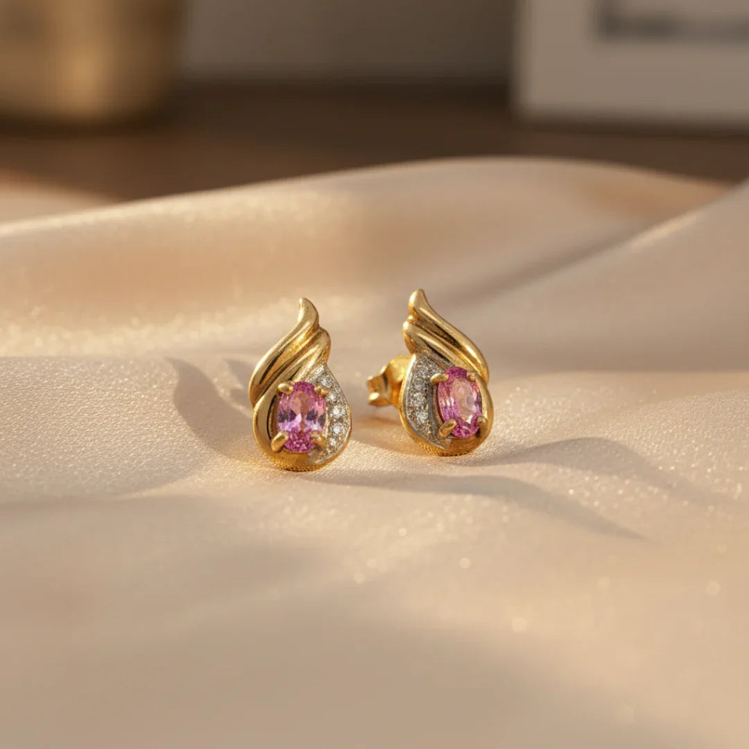 Ervaar tijdloze elegantie met deze vintage gouden oorstekers, versierd met lichtroze saffieren en afgewerkt met schitterende diamantjes. Deze oorstekers belichamen vintage design en nemen je mee terug in de tijd met hun klassieke en verfijnde uitstraling.