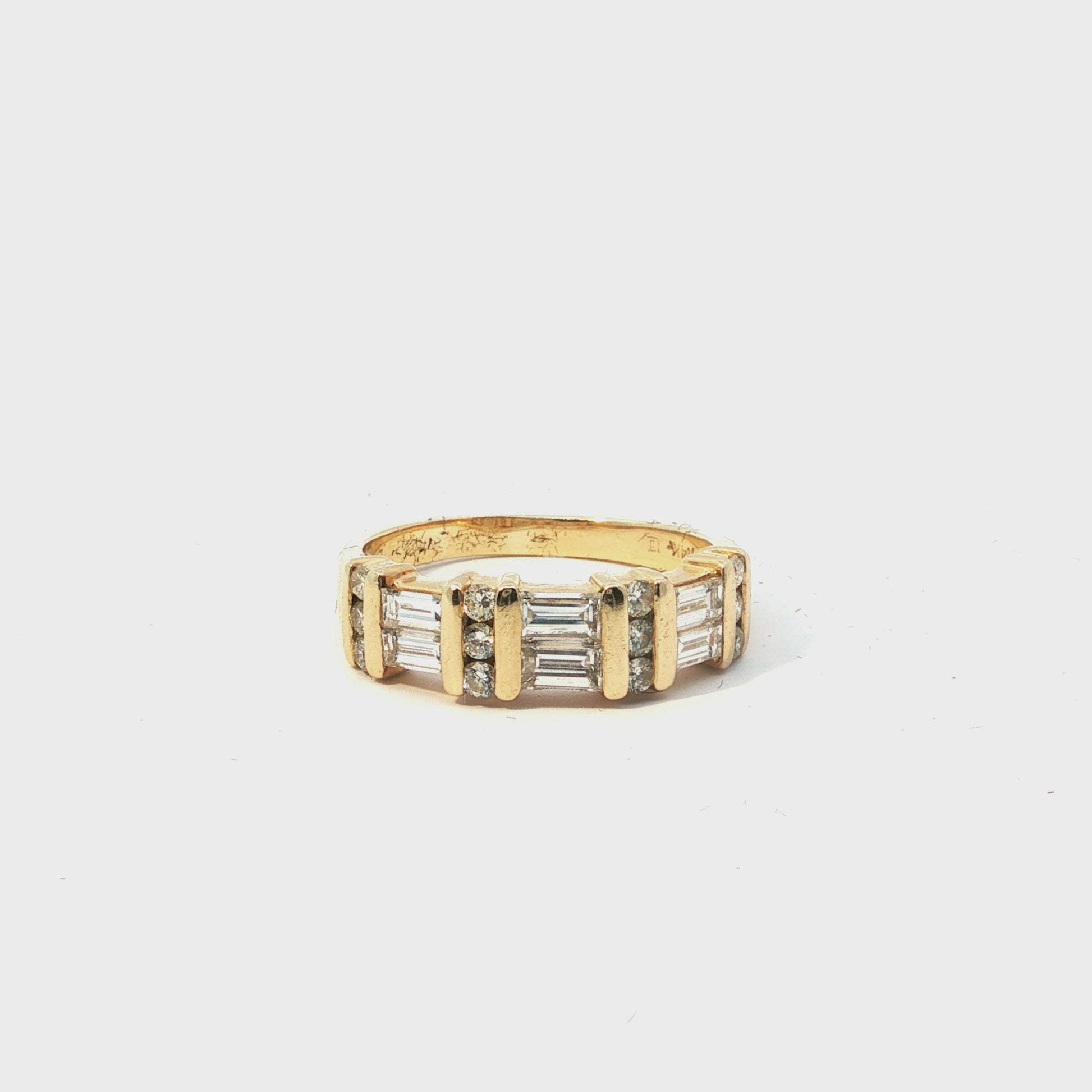 Cathy is een verfijnde vintage ring in 18 karaat geelgoud, met een opvallende baguettezetting die modern design en tijdloze elegantie samenbrengt. De ring is bezet met schitterende baguette- en briljantgeslepen diamanten, die in strakke rijen naast elkaar liggen en gevangen worden in verticale gouden spijlen – een geometrische compositie die kracht en precisie uitstraalt.