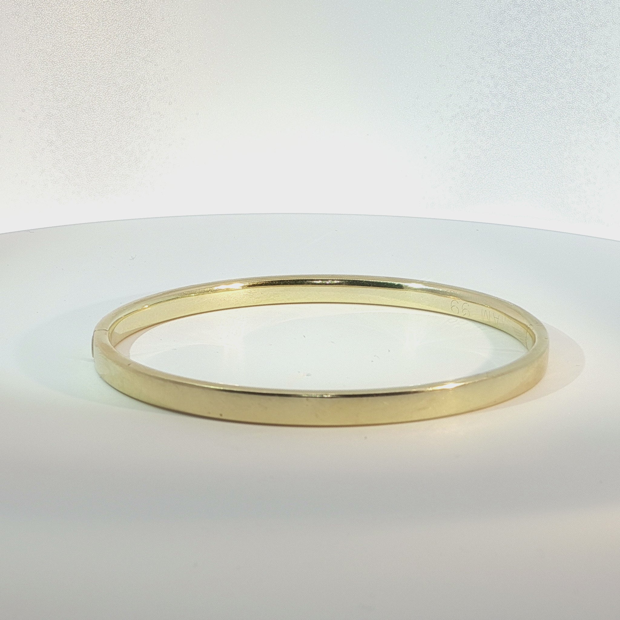 Minimalistische vintage bangle die moeiteloos kracht en finesse combineert. Dit strak vormgegeven stuk is vervaardigd uit 14 karaat goud en valt op door haar zuivere lijn en gladde afwerking.