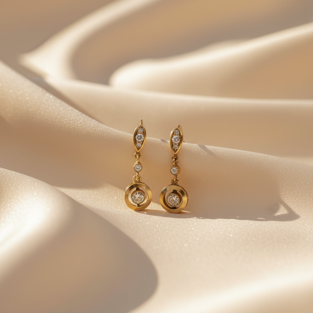 Germaine is een paar verfijnde vintage oorhangers die pure elegantie combineren met een vleugje speelsheid. Het opengewerkte ontwerp in 14 karaat goud doet denken aan de geometrische schoonheid van art deco, terwijl de subtiele diamanten fonkelen bij elke beweging. De ronde zettingen creëren een luchtig geheel dat het licht prachtig vangt.
