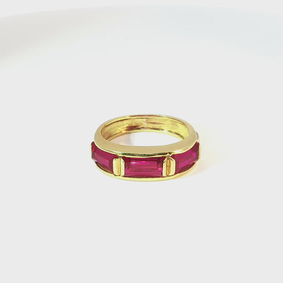 Jade is een krachtige vintage ring met een modernistische edge. In een strak, symmetrisch ontwerp zijn felroze baguette-geslepen robijnen gezet in een band van 18 karaat goud. Elke steen is ingeklemd tussen fijne, verticale gouden accenten die structuur en ritme geven aan het ontwerp – als een juweel met een eigen architectuur.