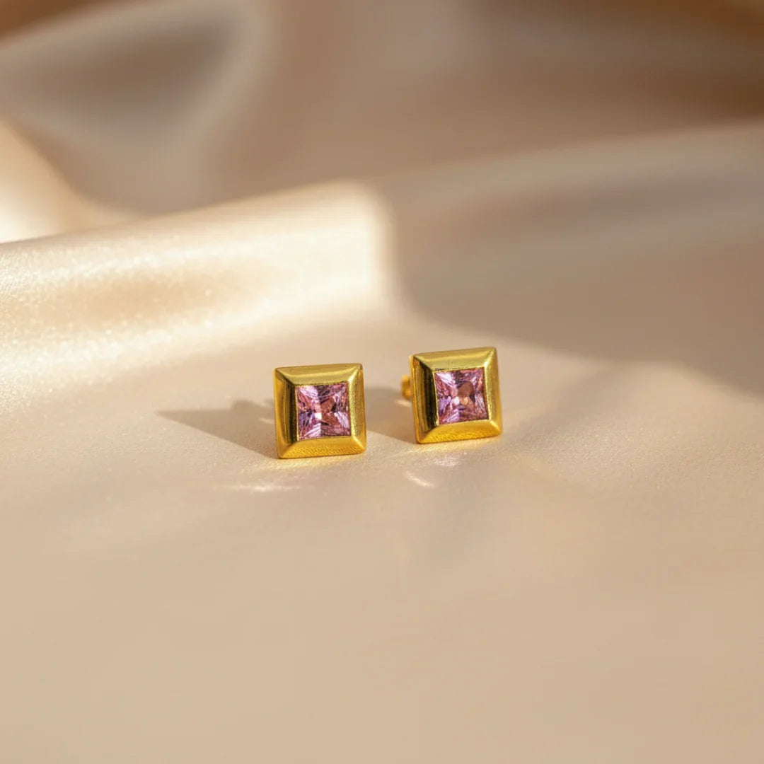 Jolie is een elegant paar vintage oorknopjes in 18 karaat goud, met centraal een vierkante prinsesgeslepen roze saffier in een strakke bezelzetting. De geometrische vorm en het warme goud zorgen voor een moderne maar toch tijdloze uitstraling – minimalistisch met een subtiele glamour-touch.
