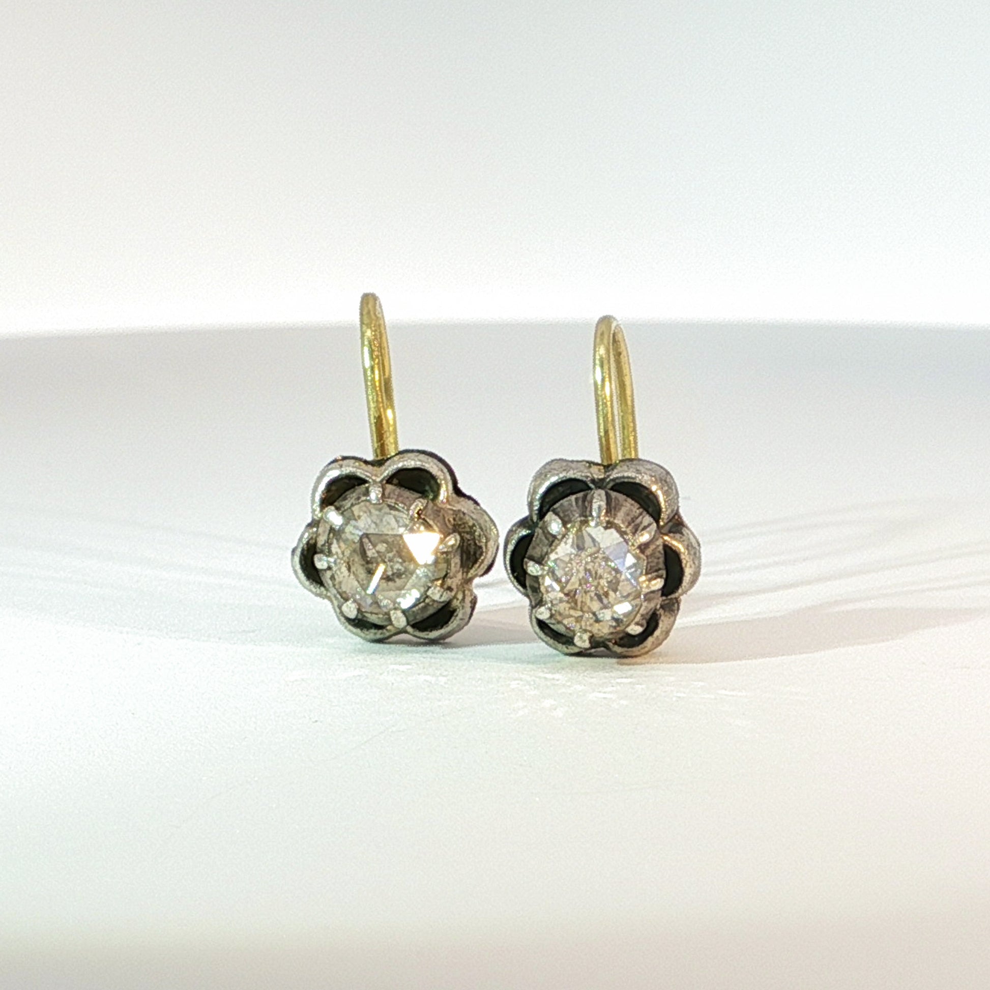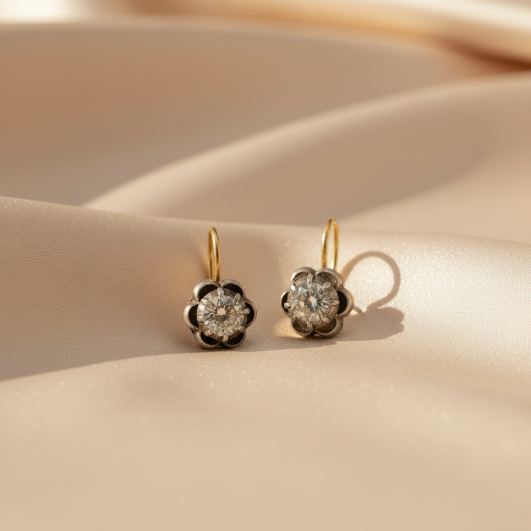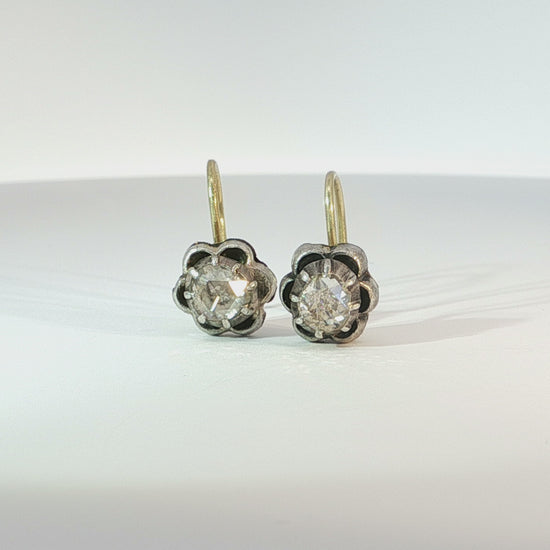 Louisa is een betoverend paar vintage oorhangers in 14 karaat goud, ontworpen in een charmante bloemvorm die doet denken aan een tijdloos erfstuk uit grootmoeders juwelenkist. Elke oorhanger draagt een sprankelende old cut diamant in een witgouden bloemzetting. Een speelse knipoog naar romantiek en vrouwelijkheid.