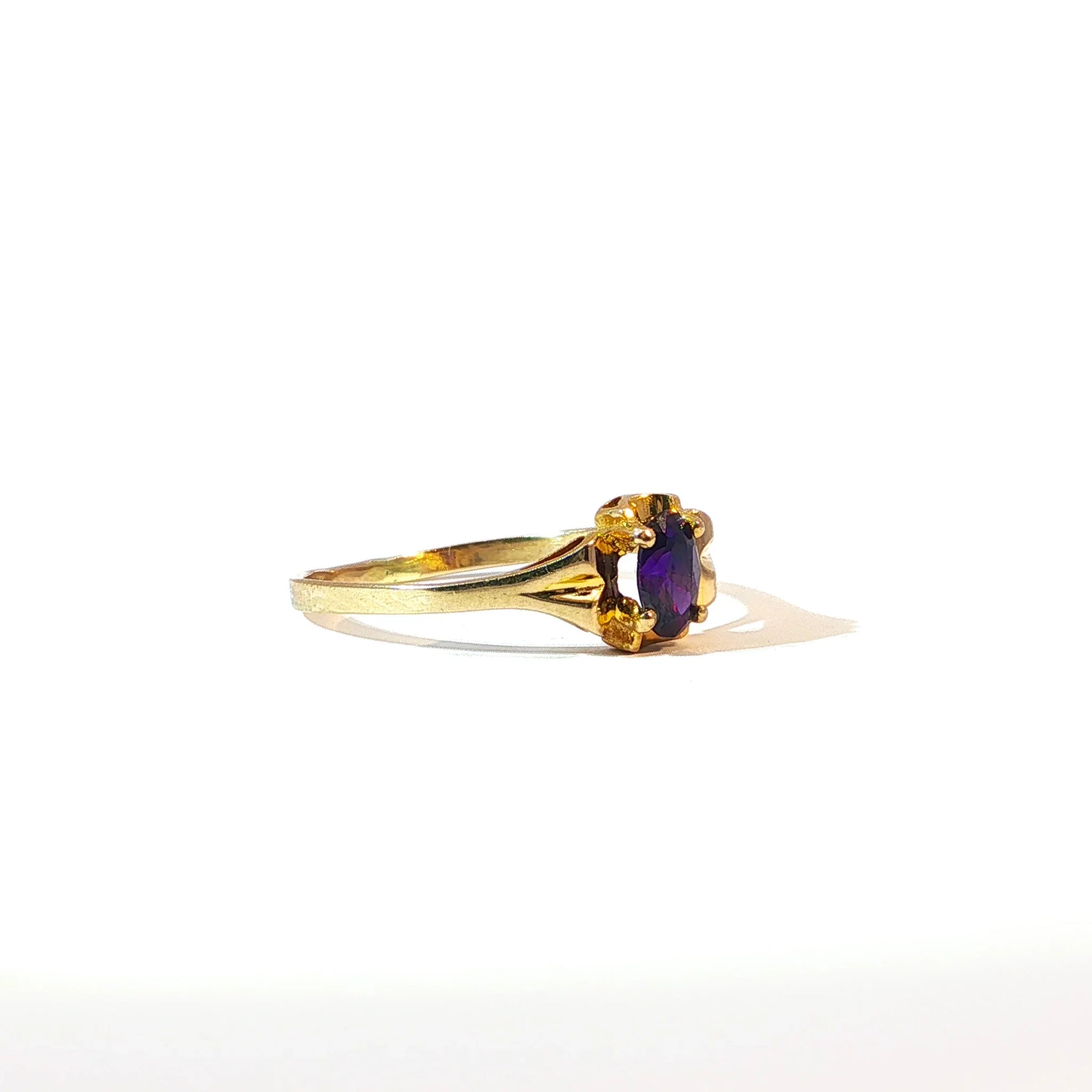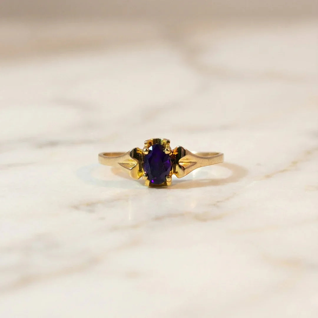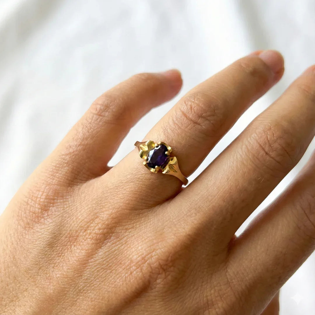 Lucie is een expressieve vintage ring met een ovale amethist in het midden, subtiel gevat in een gedetailleerde klauwzetting. De warme gloed van het 8 karaat goud vormt een prachtig contrast met de diepe paarse kleur van de steen. De sierlijke schouders van de ring geven het geheel een zachte, romantische uitstraling.