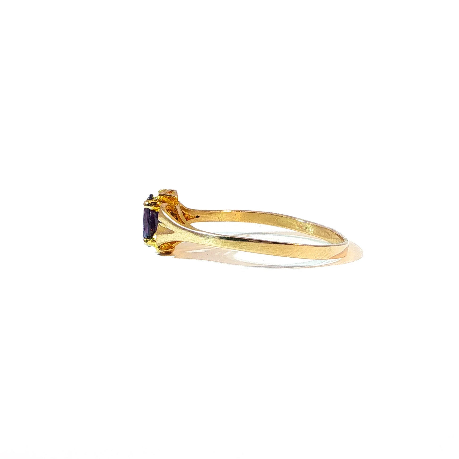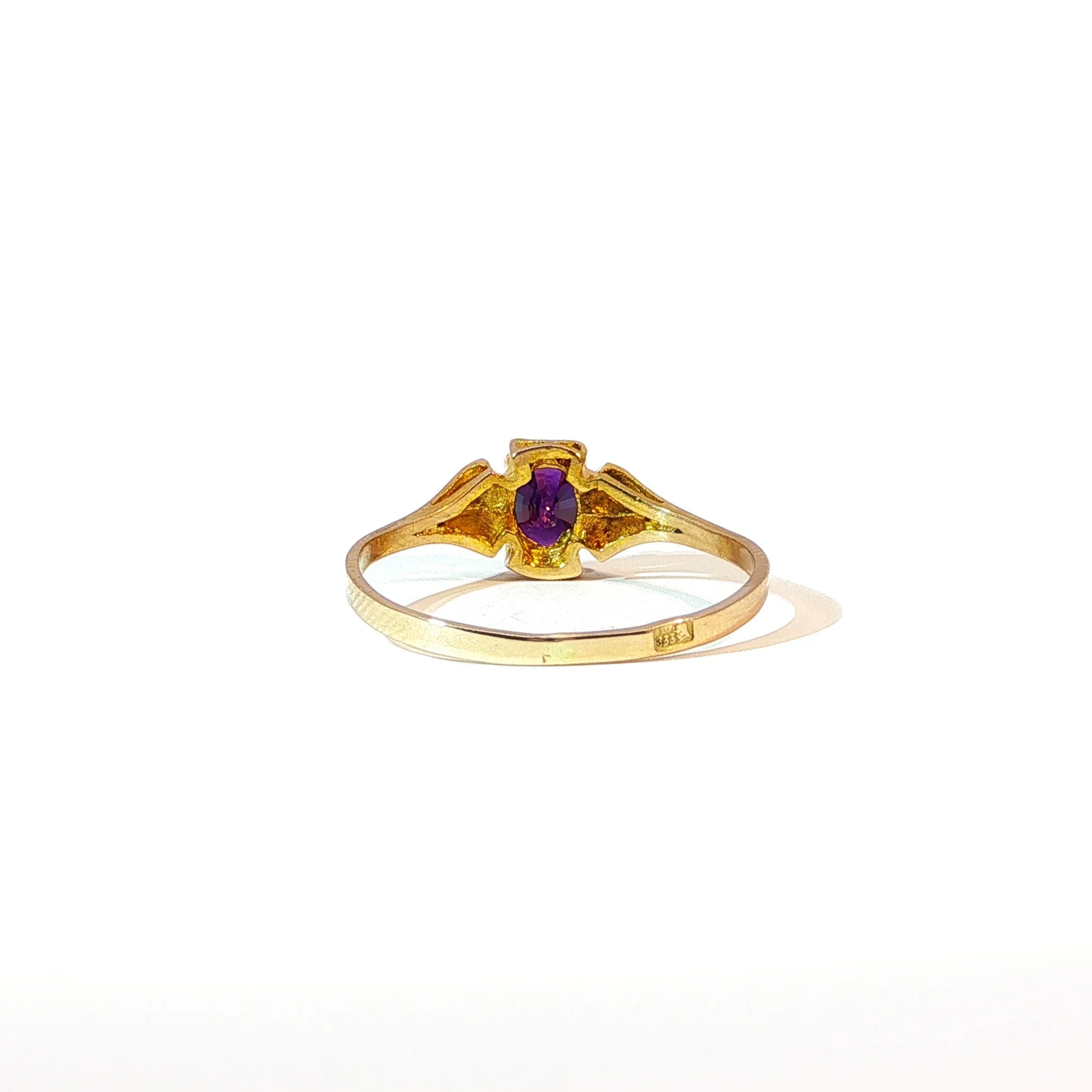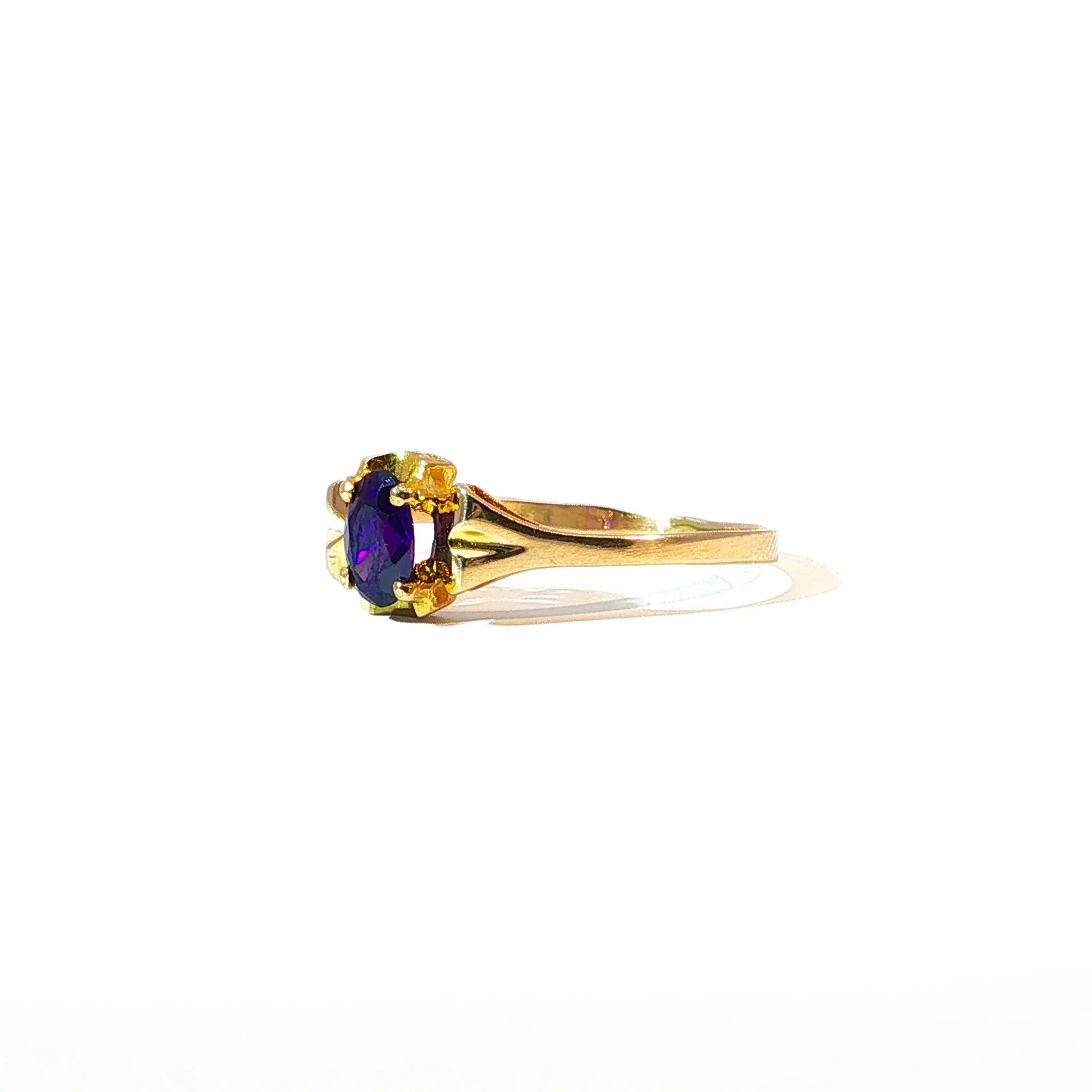Lucie is een expressieve vintage ring met een ovale amethist in het midden, subtiel gevat in een gedetailleerde klauwzetting. De warme gloed van het 8 karaat goud vormt een prachtig contrast met de diepe paarse kleur van de steen. De sierlijke schouders van de ring geven het geheel een zachte, romantische uitstraling.