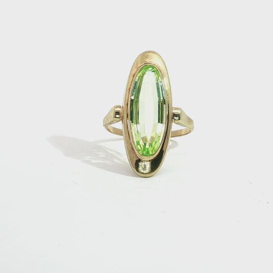Madeleine is een uitgesproken vintage statement ring in 14 karaat geelgoud, ontworpen rond een indrukwekkende prasioliet in langwerpige, ovale zetting. De steen is verticaal geplaatst en omlijst door een vloeiende gouden rand die het ontwerp extra kracht en elegantie geeft. De zachte, frisse groentint van de prasioliet vangt het licht op een subtiele manier en creëert een verfijnde maar duidelijke aanwezigheid aan de hand.