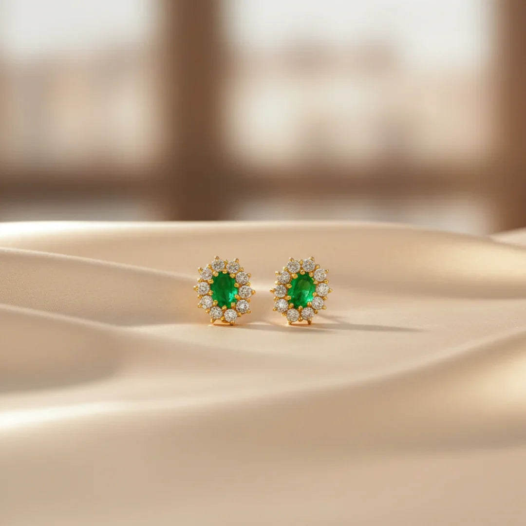 Margo is een betoverend paar vintage oorstekers in 18 karaat goud, bezet met een levendige smaragd in ovale slijpvorm, omringd door een halo van fonkelende diamanten met een totaalgewicht van maar liefst 1.2 karaat. De klassieke entouragezetting laat deze oorbellen stralen met tijdloze allure en glamour.