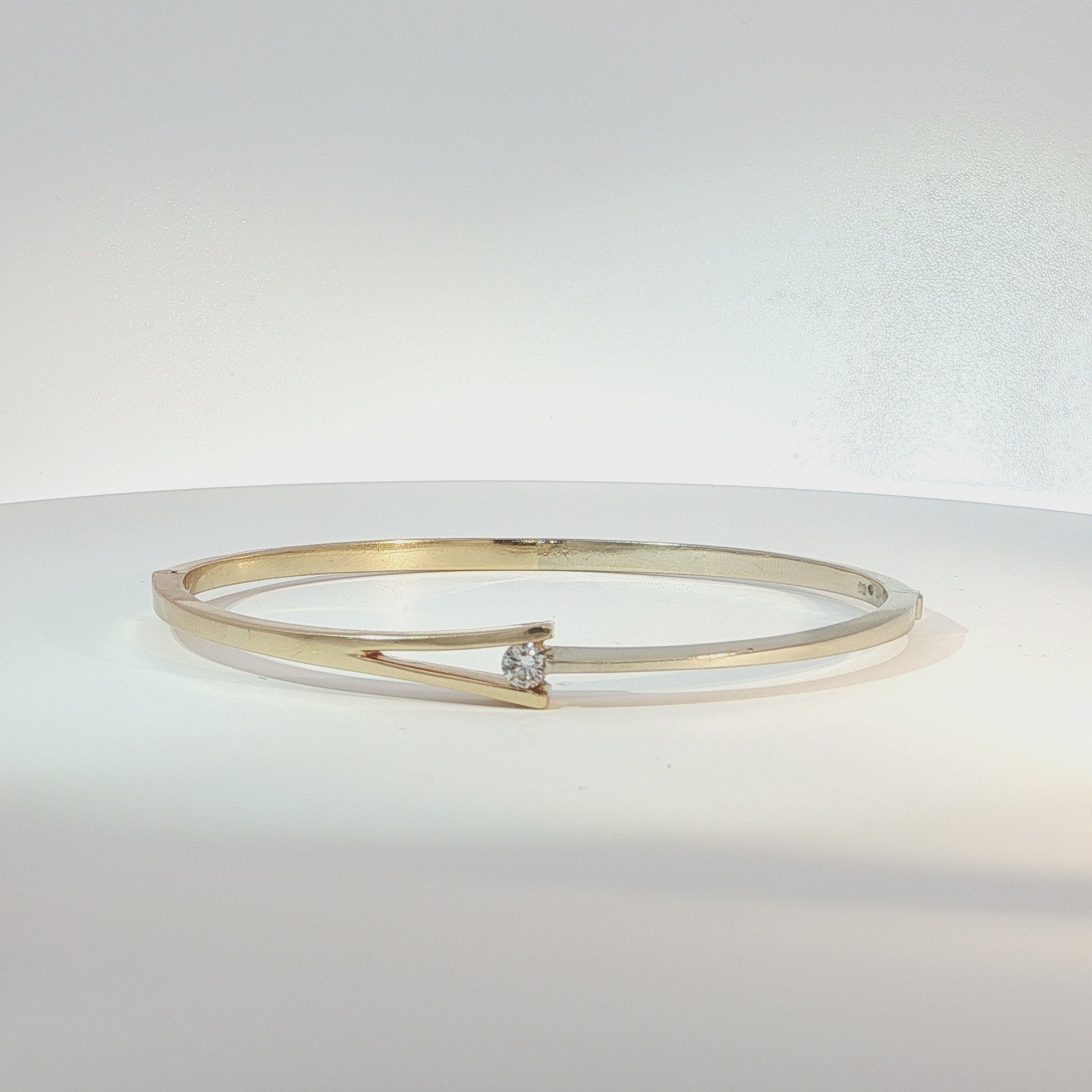 Maya is een subtiele vintage armband die pure elegantie uitstraalt. Het verfijnde ontwerp in 14 karaat goud wordt geaccentueerd door een enkele schitterende diamant, gezet in een moderne, opengewerkte V-vorm die het licht prachtig opvangt. Less is more – deze armband bewijst hoe één zorgvuldig gekozen detail je hele look kan verheffen.