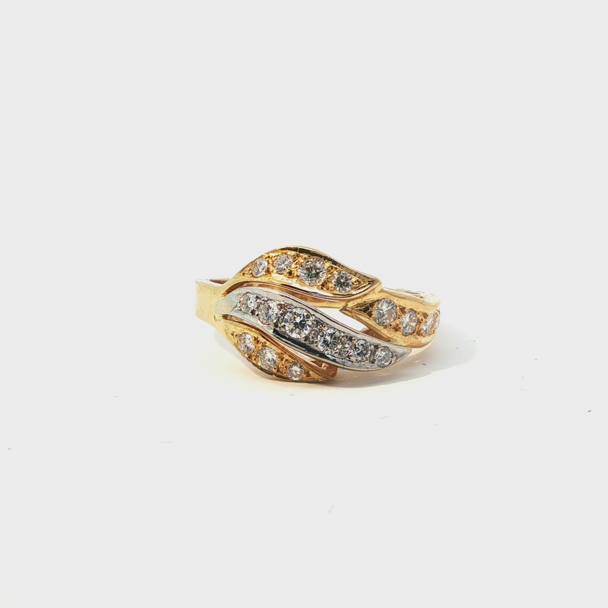 Noella is een gracieuze vintage ring in 18 karaat goud, vormgegeven met een speels golvend ontwerp. De ring is bezet met fonkelende diamanten die zich elegant over het golvende lijnenspel verspreiden, wat het geheel een organische, luxueuze uitstraling geeft.