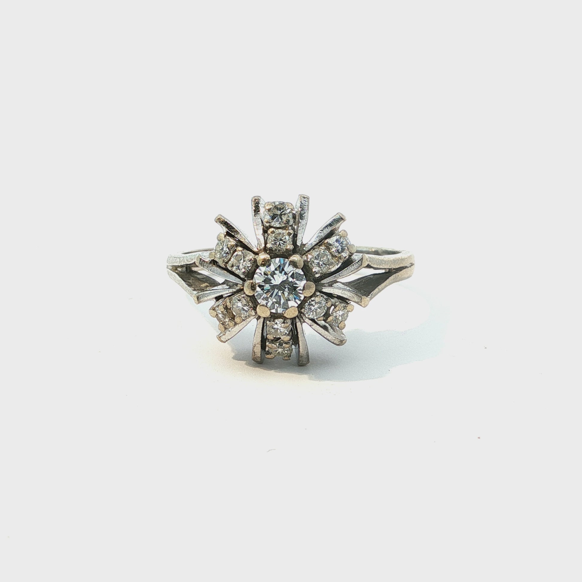 Rosina is een karaktervolle vintage ring in 18 karaat witgoud, vormgegeven in een speelse en expressieve clusterzetting. In het hart schittert een briljant geslepen diamant, omringd door twaalf kleinere diamanten die samen een bloemachtig stermotief vormen. De architecturale lijnen en open details in de schouders geven de ring extra flair en een opvallend driedimensionaal karakter.