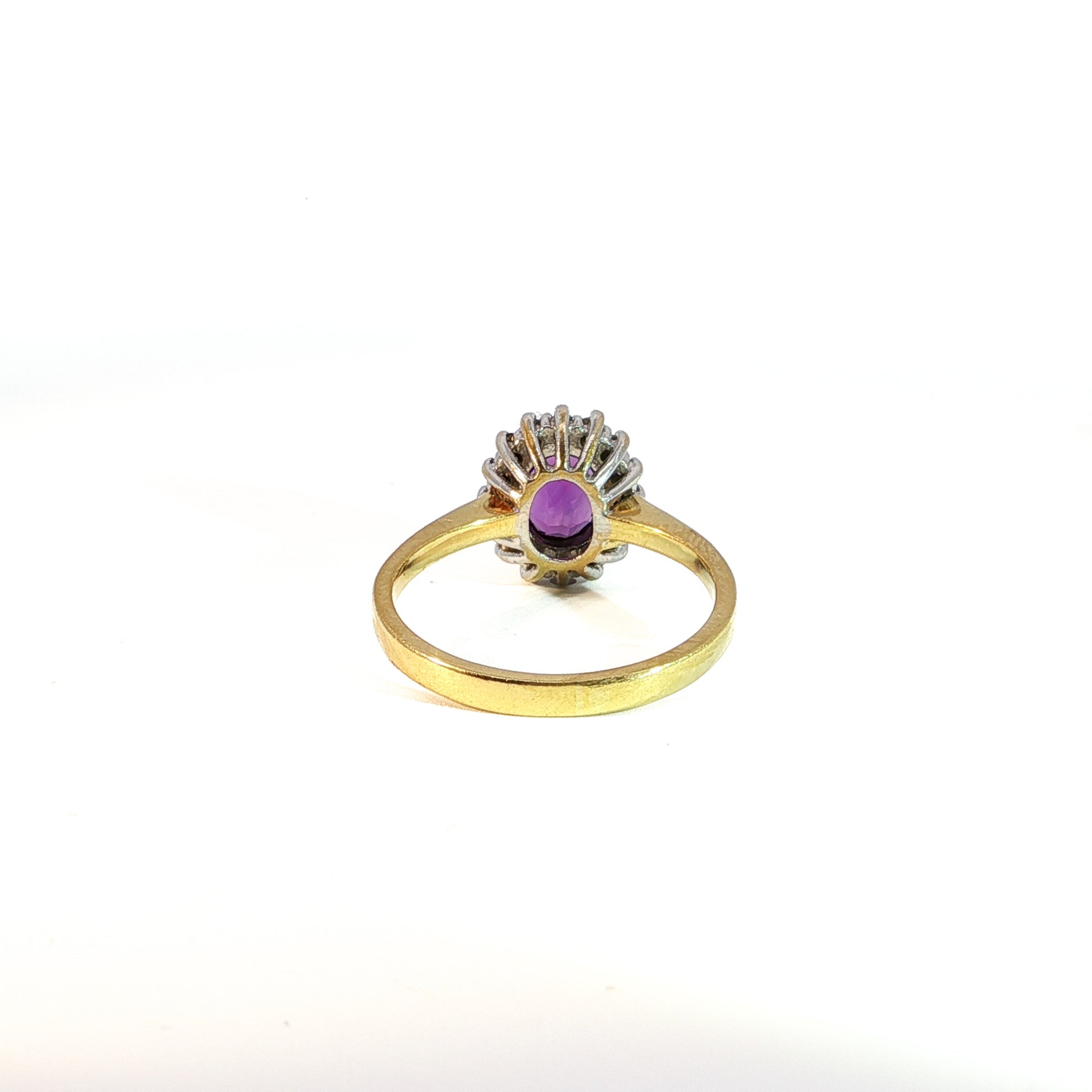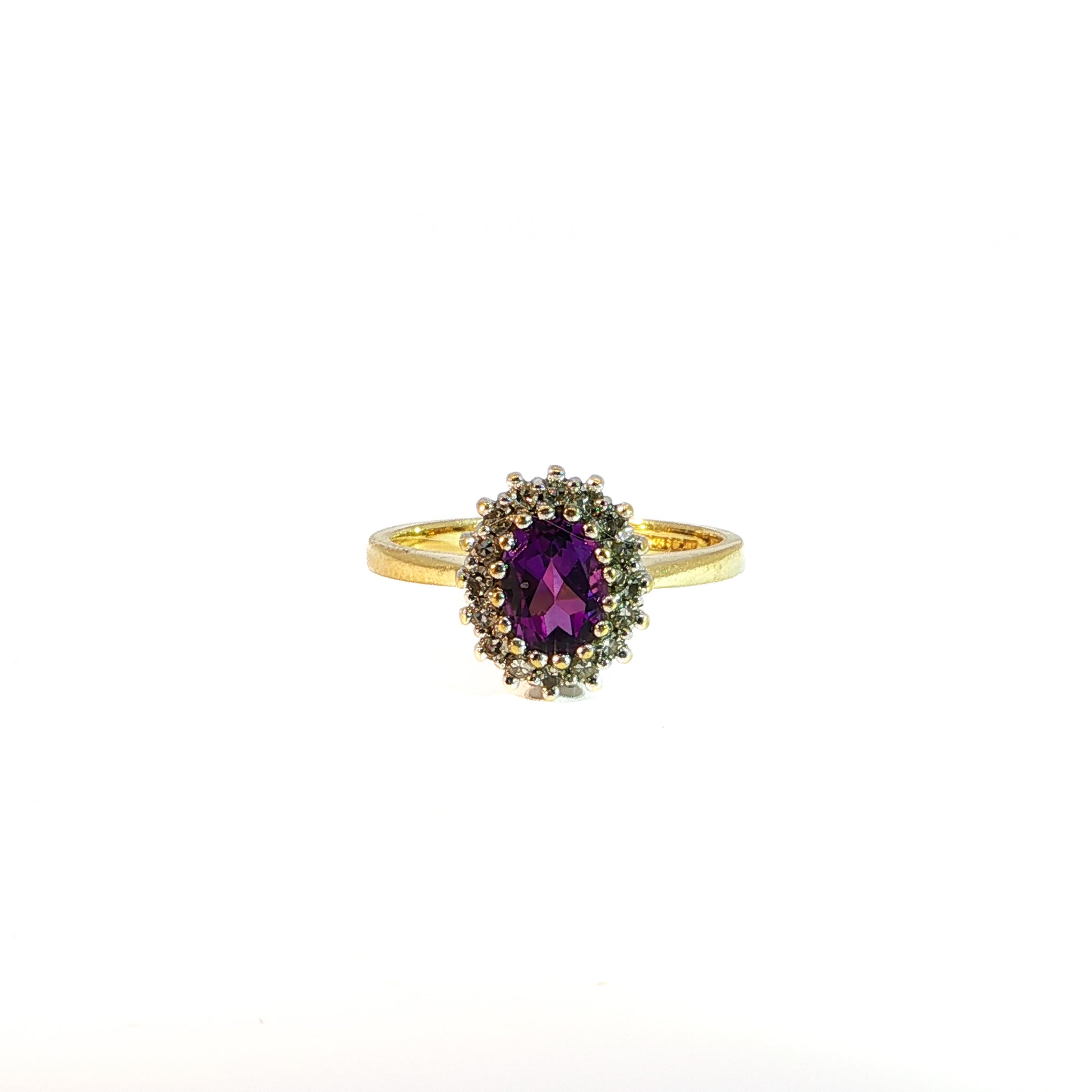 Suzanna is een vrouwelijke vintage ring in 18 karaat goud, met een weelderige ovale amethist in het midden, omringd door een bloemvormige cluster van sprankelende diamanten.